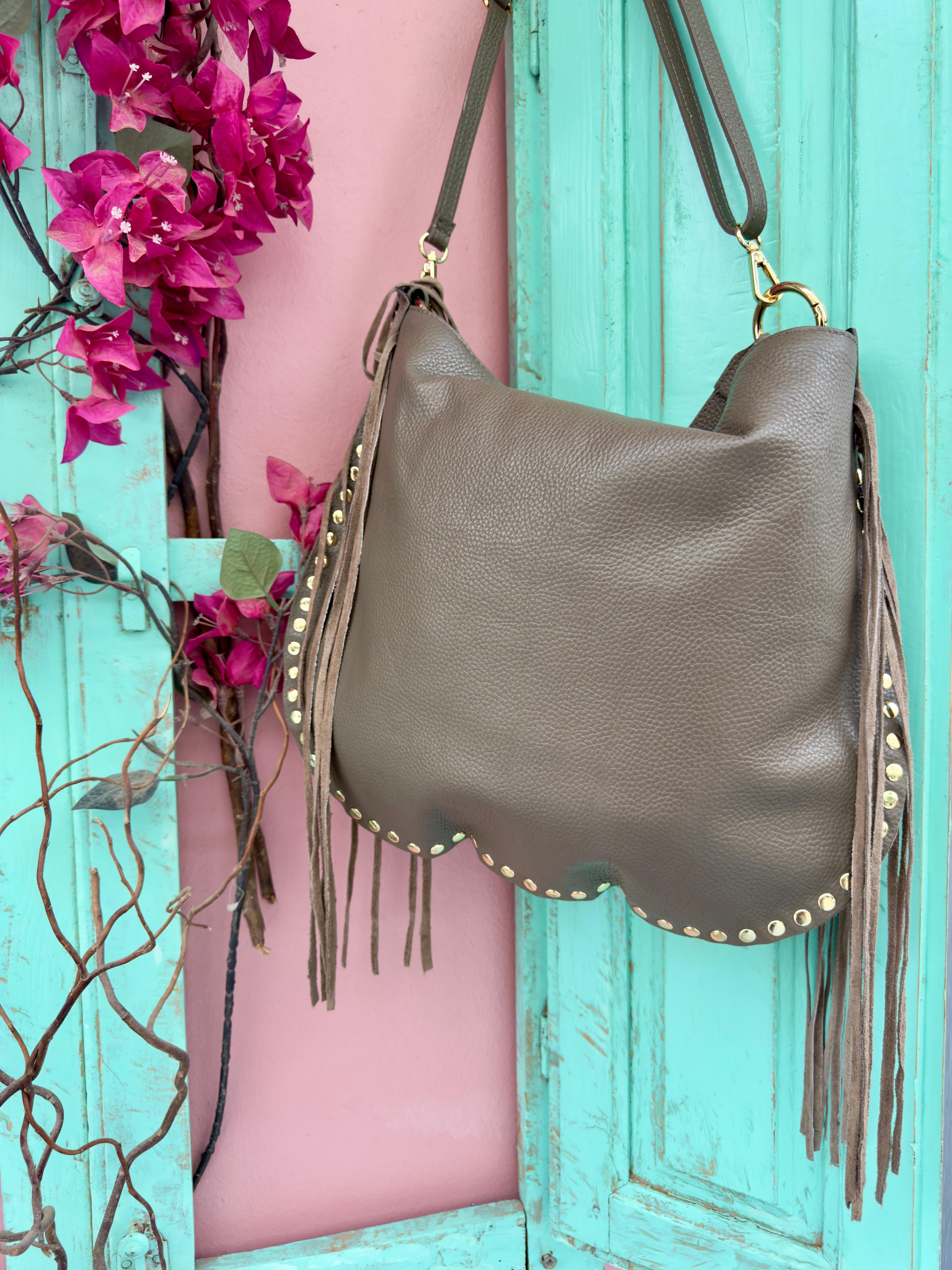 Bolso de piel combinada color ocre con flecos. Asa fija con detalles metálicos y correa extraíble con mosquetón. Cierre con botón e interior forrado con compartimento.