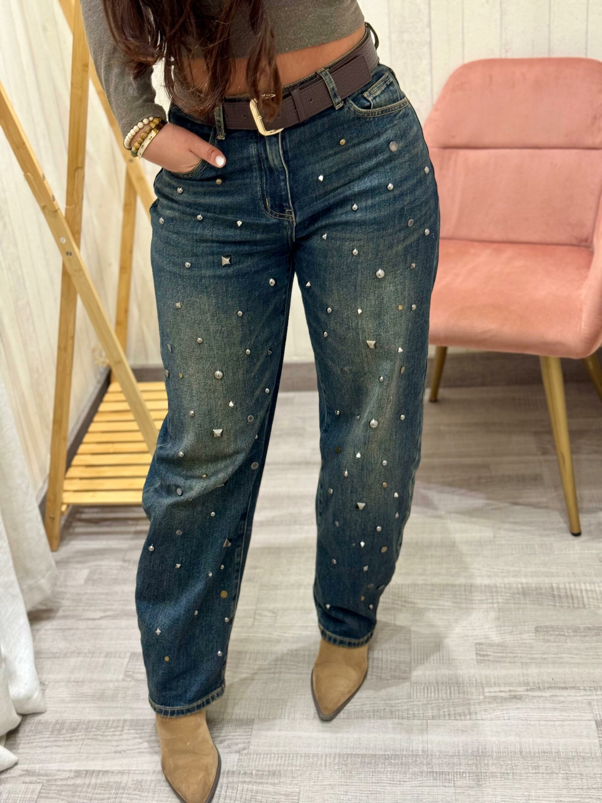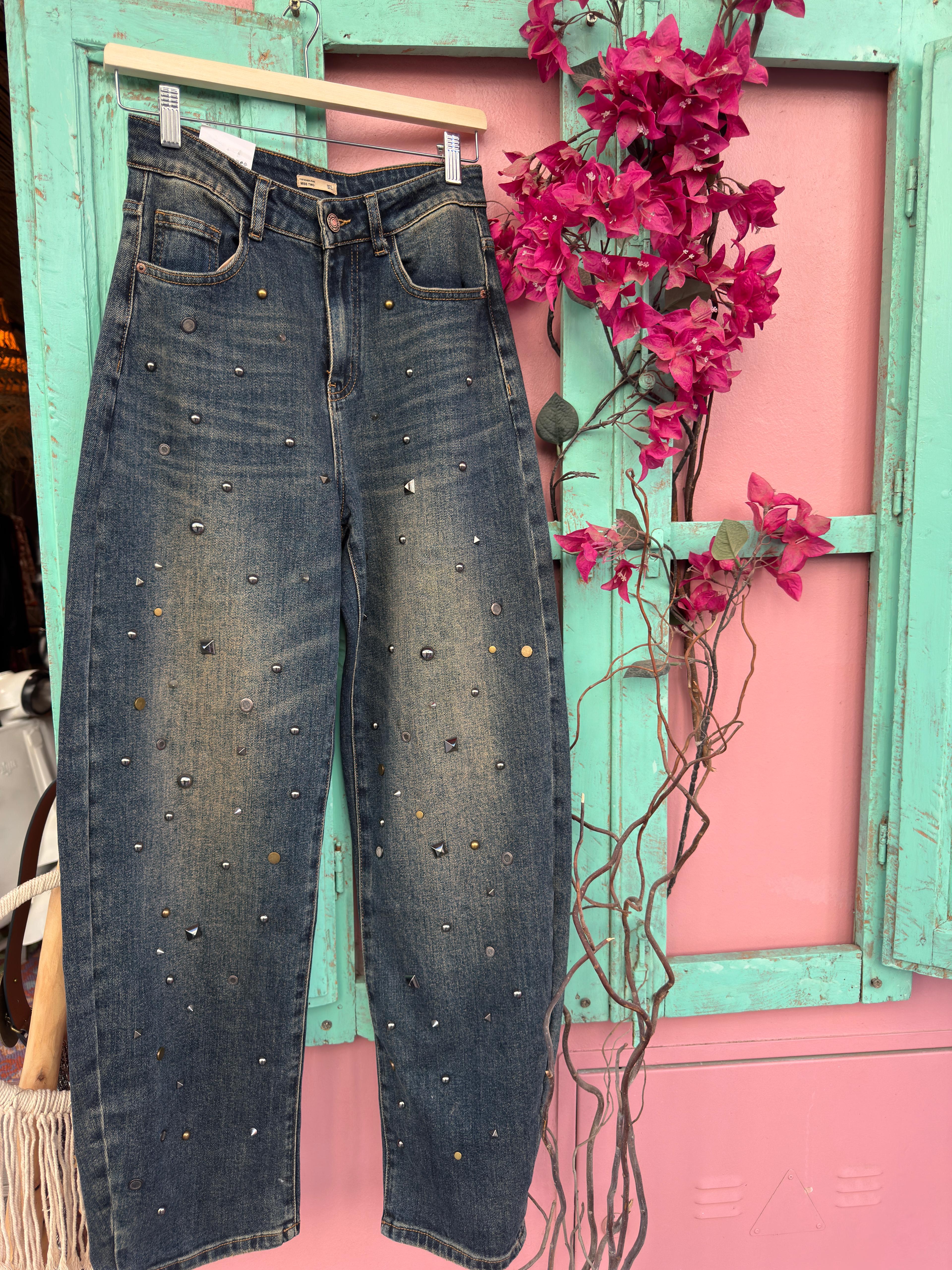 Pantalones vaqueros corte bombacho con tachas en plata y bronce